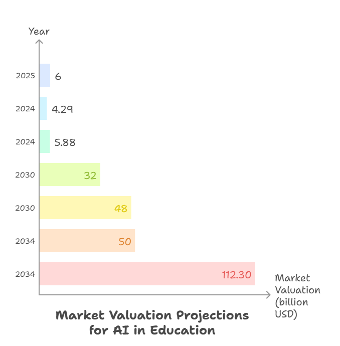 By 2034, estimates stretch from conservative $50 billion figures to the ambitious $112.30 billion projection. The wide range reflects uncertainty about regulatory support, infrastructure development, and teacher acceptance rates.