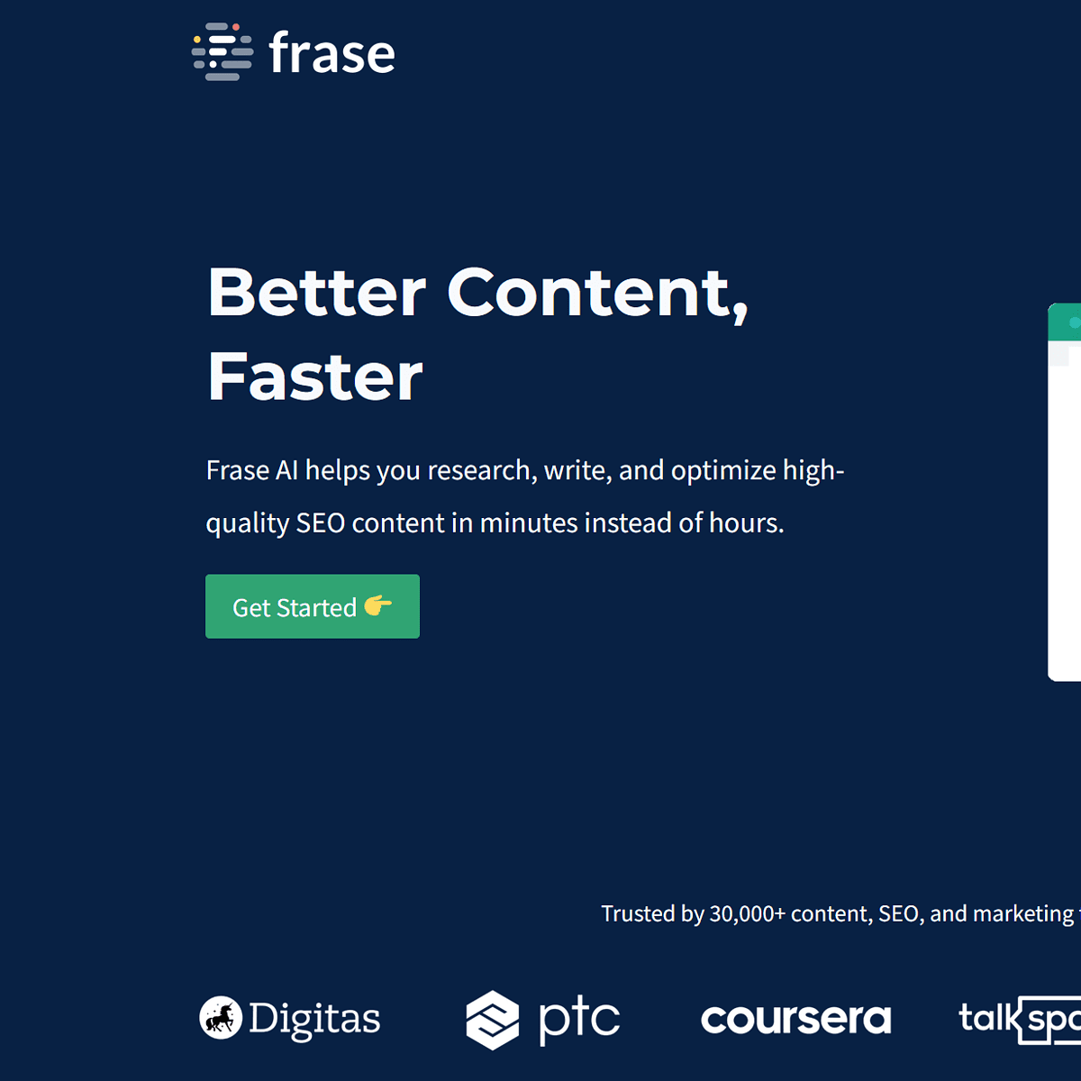 Frase.io is a content optimisation tool that helps improve the quality and relevance of your content for search engines and readers. It uses AI-powered algorithms to analyse your content and suggest improvements to make it more SEO-friendly and engaging.