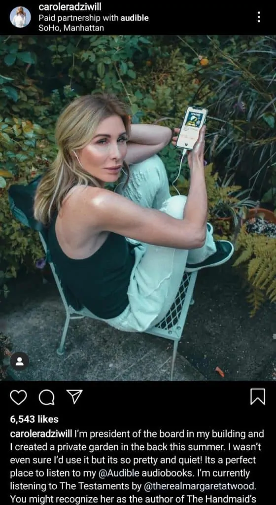 For instance, here Audible – a company that makes audiobooks, partnered with Carole Radziwill and tried to place their product in a natural, comfortable and non-direct setting
