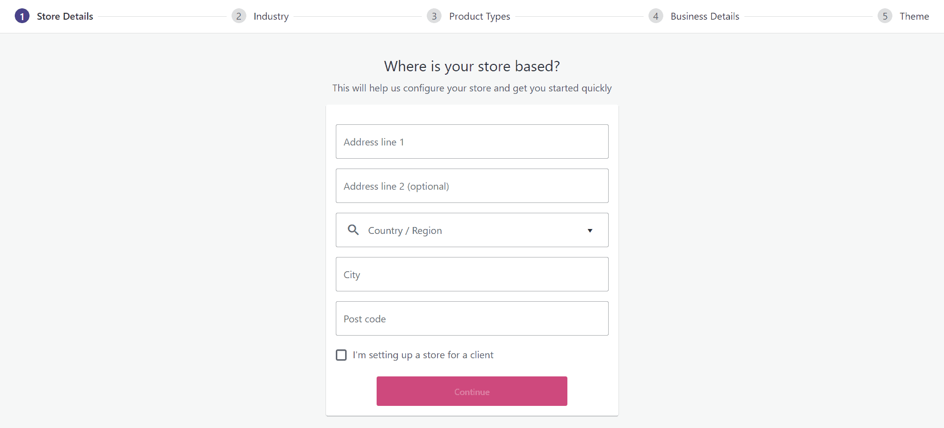 The first page of the WooCommerce set-up wizard would ask you for some basic details like your city, pin code, country, etc.