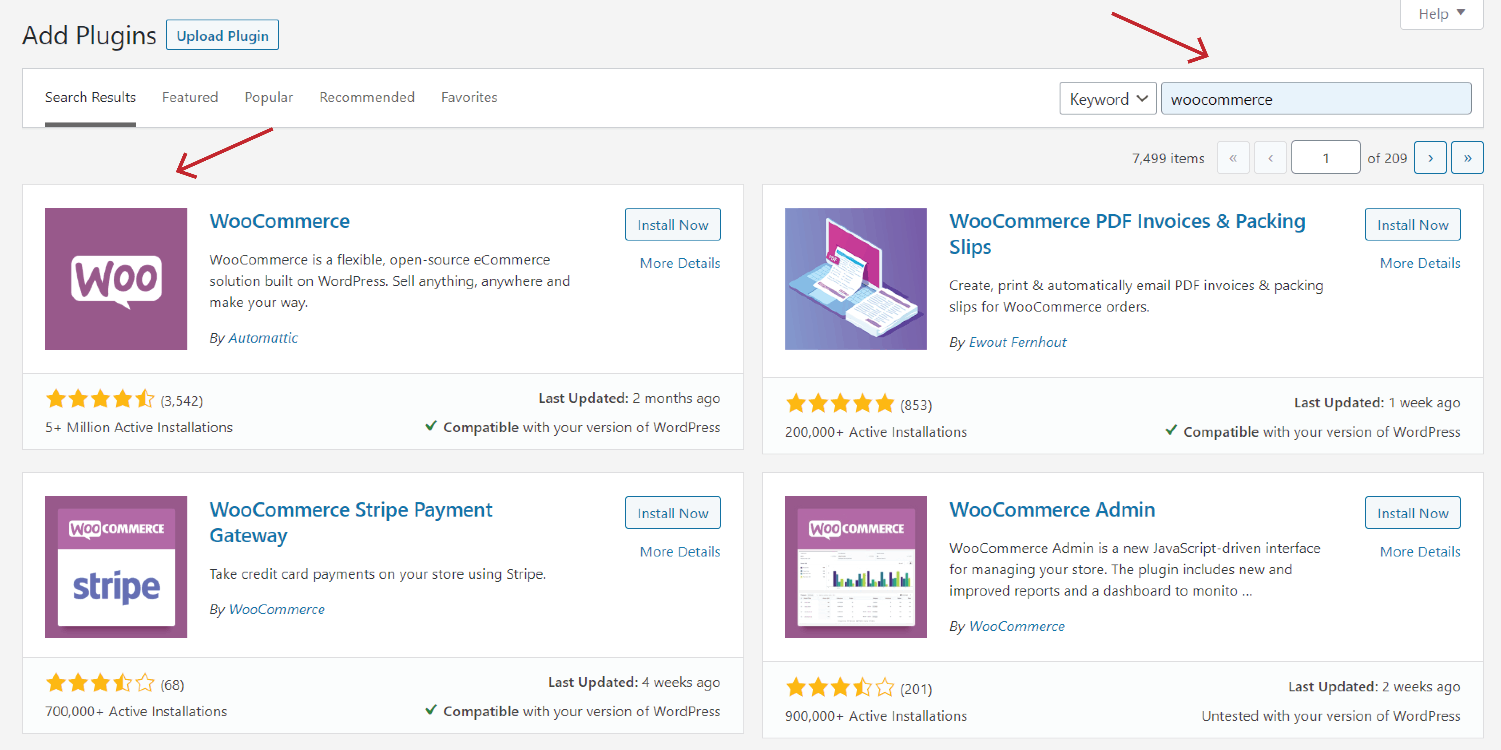 After that, you can use the search bar and search for ‘WooCommerce’. Click on ‘Install now’ for the right WooCommerce plug-in, as shown below.