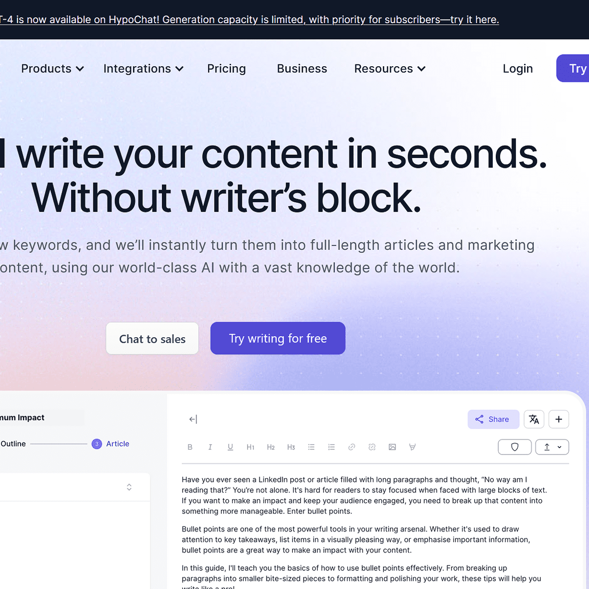 - To Cut Short Research Time: Hypotenuse AI, “The AI content generator that monitors live content from the internet and researches topics in real-time, extracting key insights and talking points from trending articles so you can start writing instantly.”