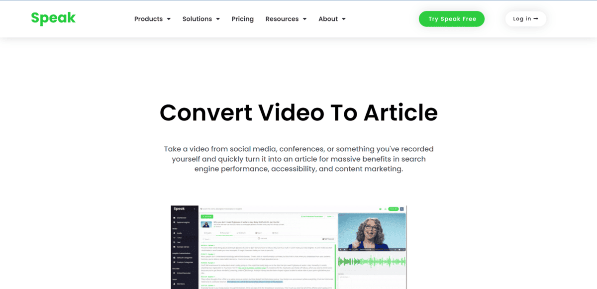 - To transcribe videos into articles: Speak AI, “A complete video editor studio that allows to convert video to text and convert them into written articles. Using this feature allows the blogger massive benefits in search engine performance, accessibility, and content marketing.”