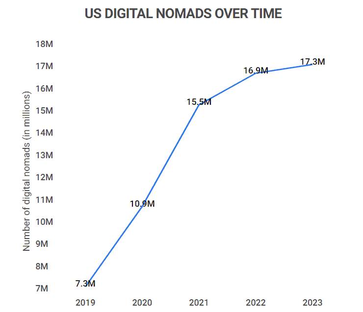 As of 2024, there are approximately 40 million digital nomads worldwide, with 17.3 million of them residing in the United States alone. This marks a 131% increase from pre-pandemic levels.