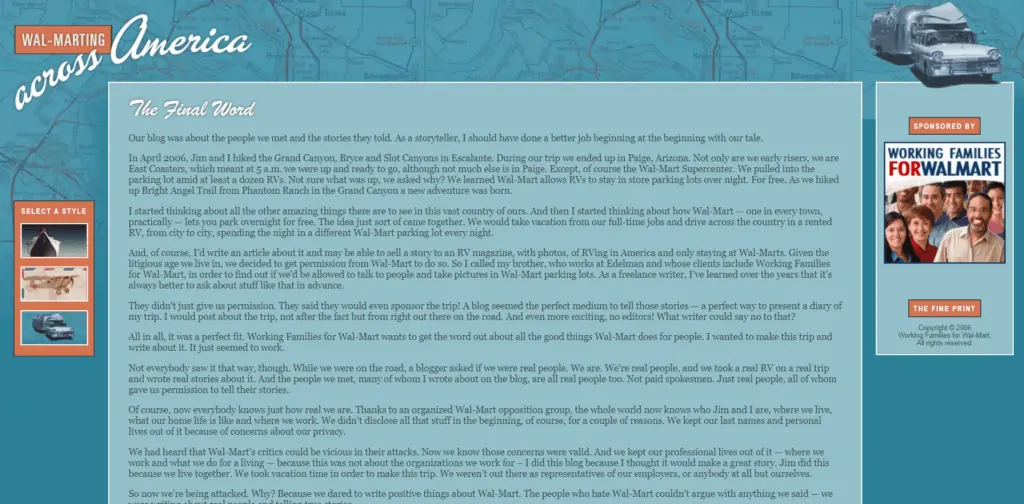 A couple wrote a blog, chronicling adventures in different Walmarts throughout the United States in 2006. The blog was very well received by the public and gained an enormous following. However, it lost its charm when it was publicised that Walmart itself sponsored it.